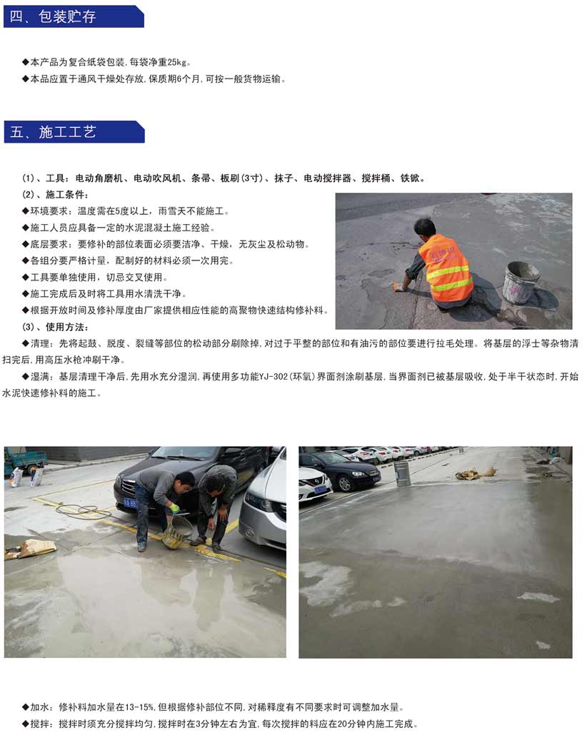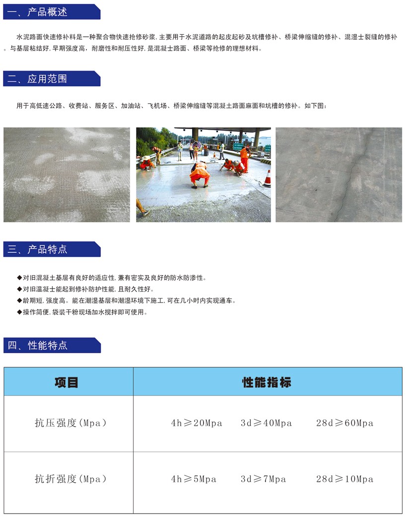 水泥路面快速修補(bǔ)料是一種聚合物快速搶修砂漿,主要用于水泥道路的起皮起砂及坑槽修補(bǔ)、橋梁伸縮縫的修補(bǔ)、混濕士裂縫的修補(bǔ)與基層粘結(jié)好,早期強(qiáng)度高,耐磨性和耐壓性好,是混凝士路面、橋梁等搶修的理想材料。